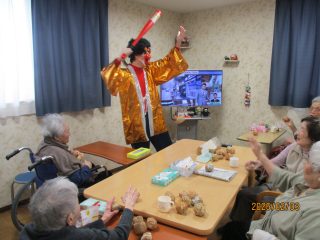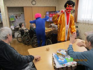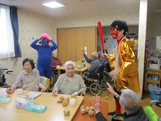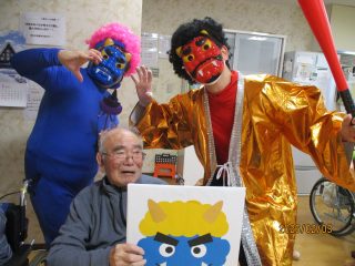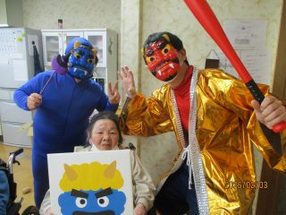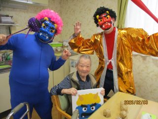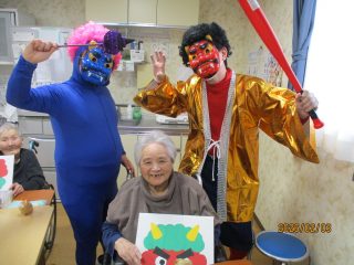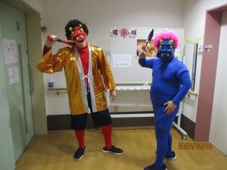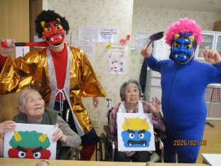 本日、節分の豆まきを行いました! 「鬼は外!福は内!」という皆様の力強い声掛けに、赤鬼と青鬼もすっかり降参したようです